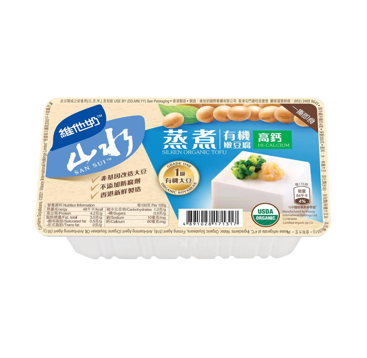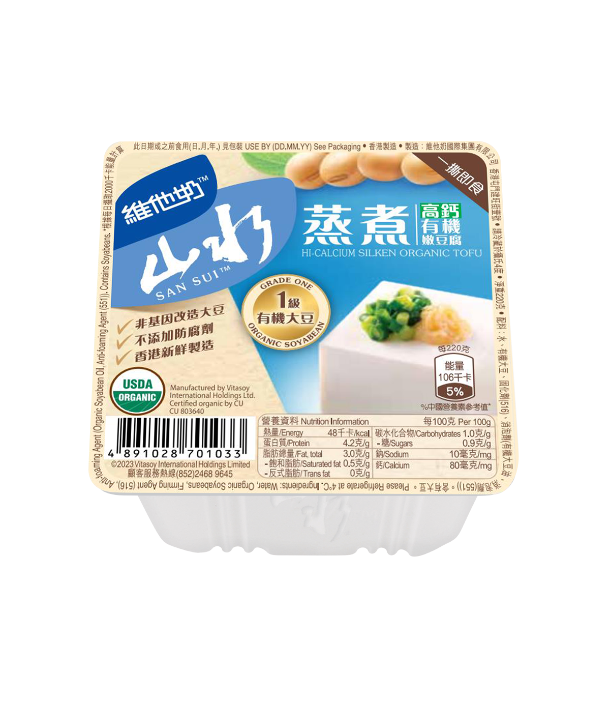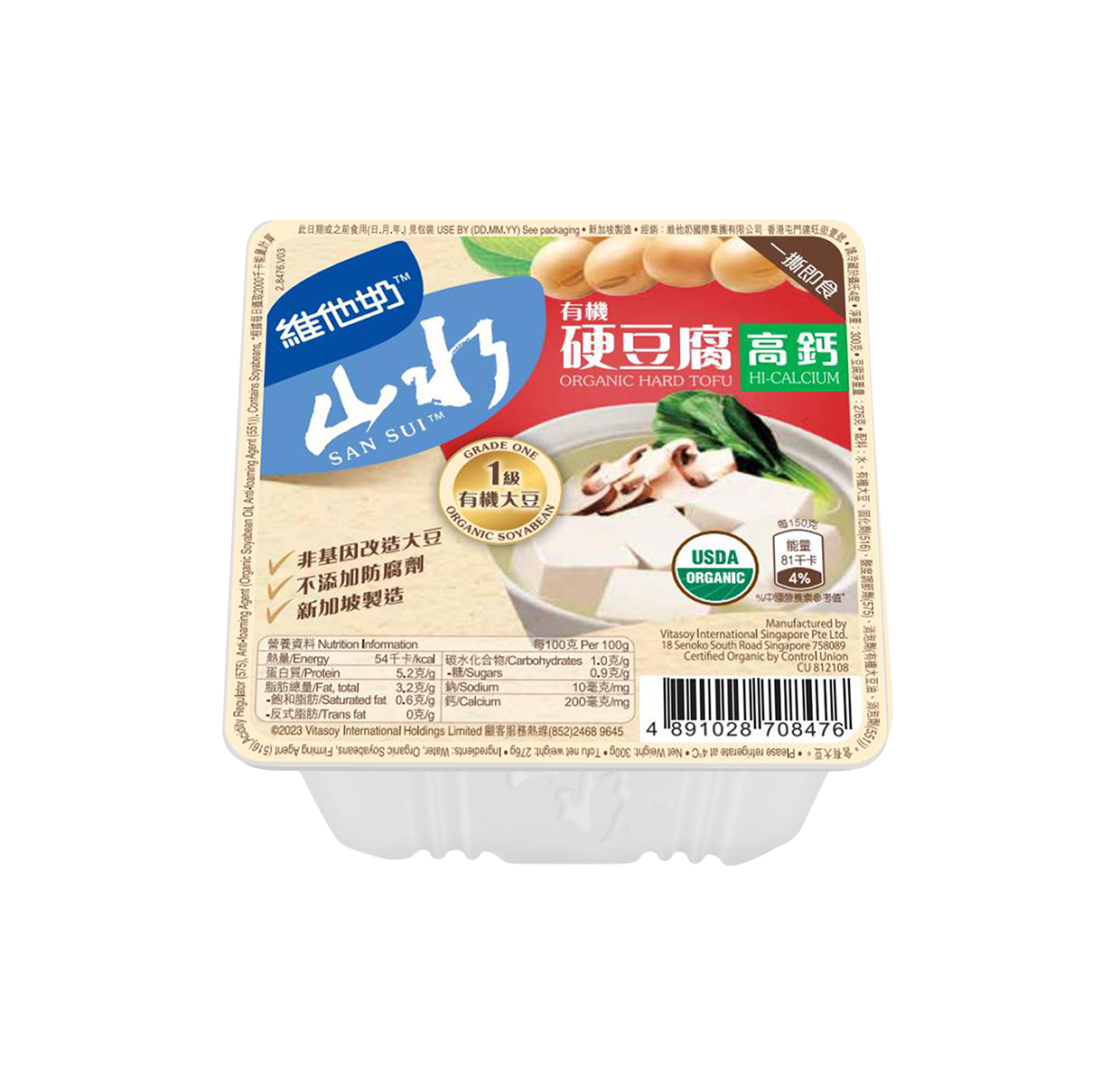 Strictly selection of "first-grade organic soybeans" provide a healthy and quality of life to consumer . Freshly made in Hong Kong everyday, inherits the traditional stone-ground processing method, offering smooth and rich in flavour . Granted USDA organic certification and no preservatives are added, which are suitable for healthy-conscious individuals. Vitasoy Sansui Organic Hard Tofu is calcium-rich, fulfilled your 50%+ daily calcium intake^.