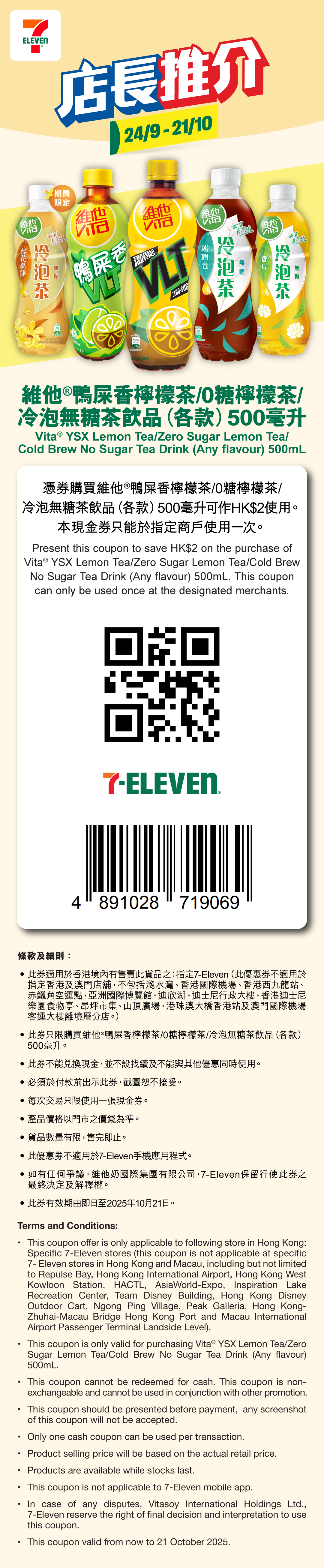 憑此券於7-Eleven購買維他鴨屎香香水檸檬茶/0糖檸檬茶/冷泡無糖茶飲品(各款)500毫升可作$2使用。