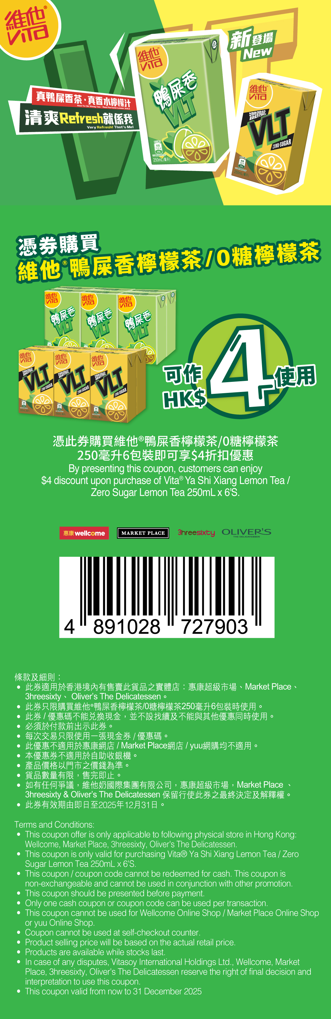 於指定超級市場購買維他鴨屎香香水檸檬茶或維他0糖檸檬茶時出示以下現金券,即享$4折扣優惠!