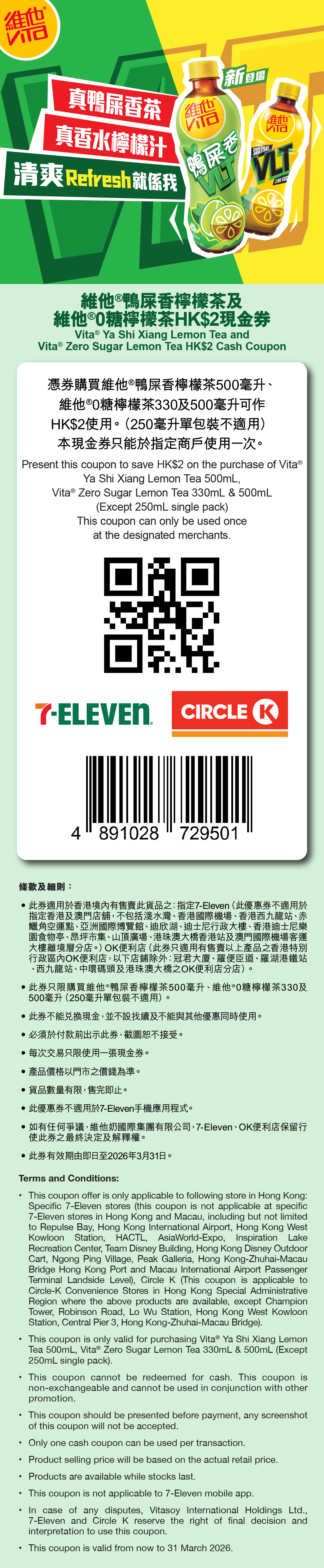 於指定便利店購買維他鴨屎香香水檸檬茶或維他0糖檸檬茶時出示以下現金券,即享$2折扣優惠!