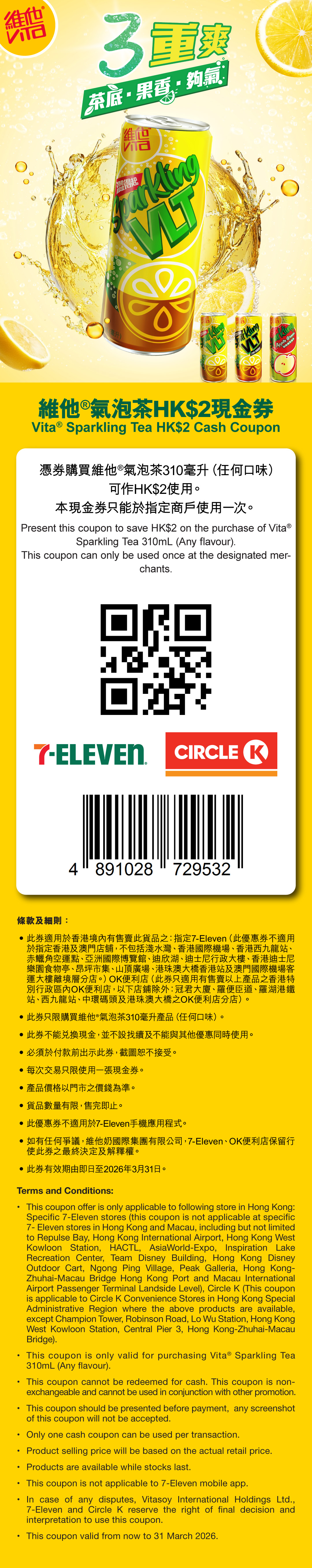 由即日至2026年3月31日, 於指定便利店購買維他氣泡茶即享現金折扣優惠!