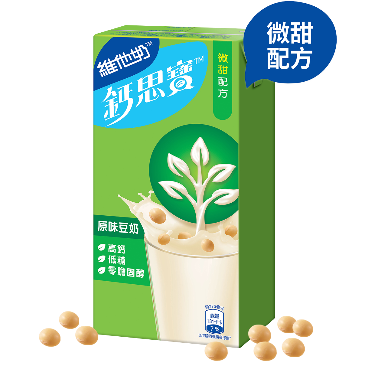 維他奶鈣思寶高鈣高蛋白質豆奶提供「高鈣」及「高蛋白」雙重健康營養,除了有助維持骨骼健康的高鈣營養外,每盒更含有10g優質植物蛋白,等於約1.5隻雞蛋^,有助肌肉生長及修復,健康營養LEVEL UP!加上低糖及零膽固醇,多重營養,是健康的純素新選擇。