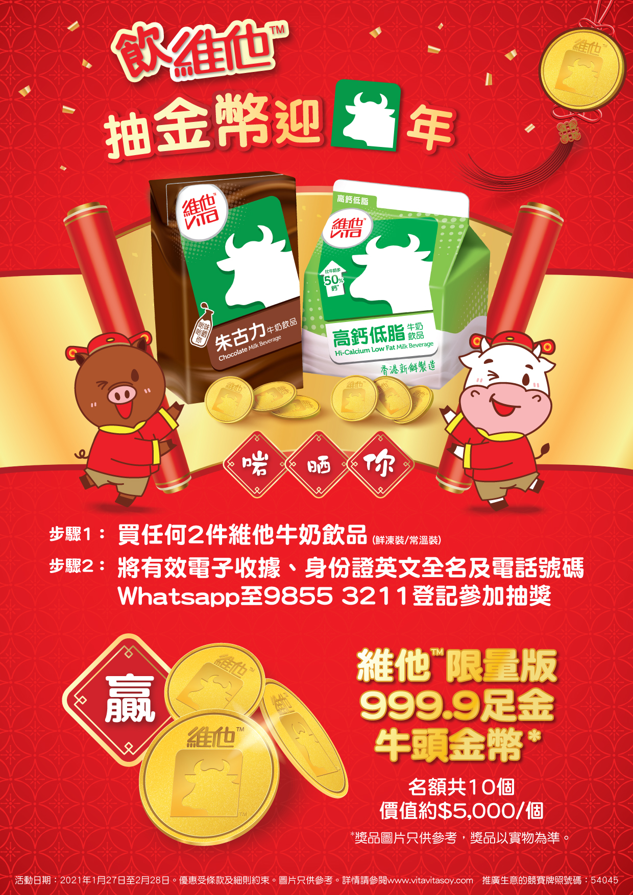 - 凡於推廣期內於任何香港區之指定大型超級市場、便利店或網上商店^購買(以單一收據計算)任何2件維他牛奶/朱古力奶飲品(詳情請參閱條款3),憑有效電子收據即可參加抽獎,有機會贏取維他限量版999.9足金牛頭金幣1個 價值約$5,000/個 (名額共10個)
